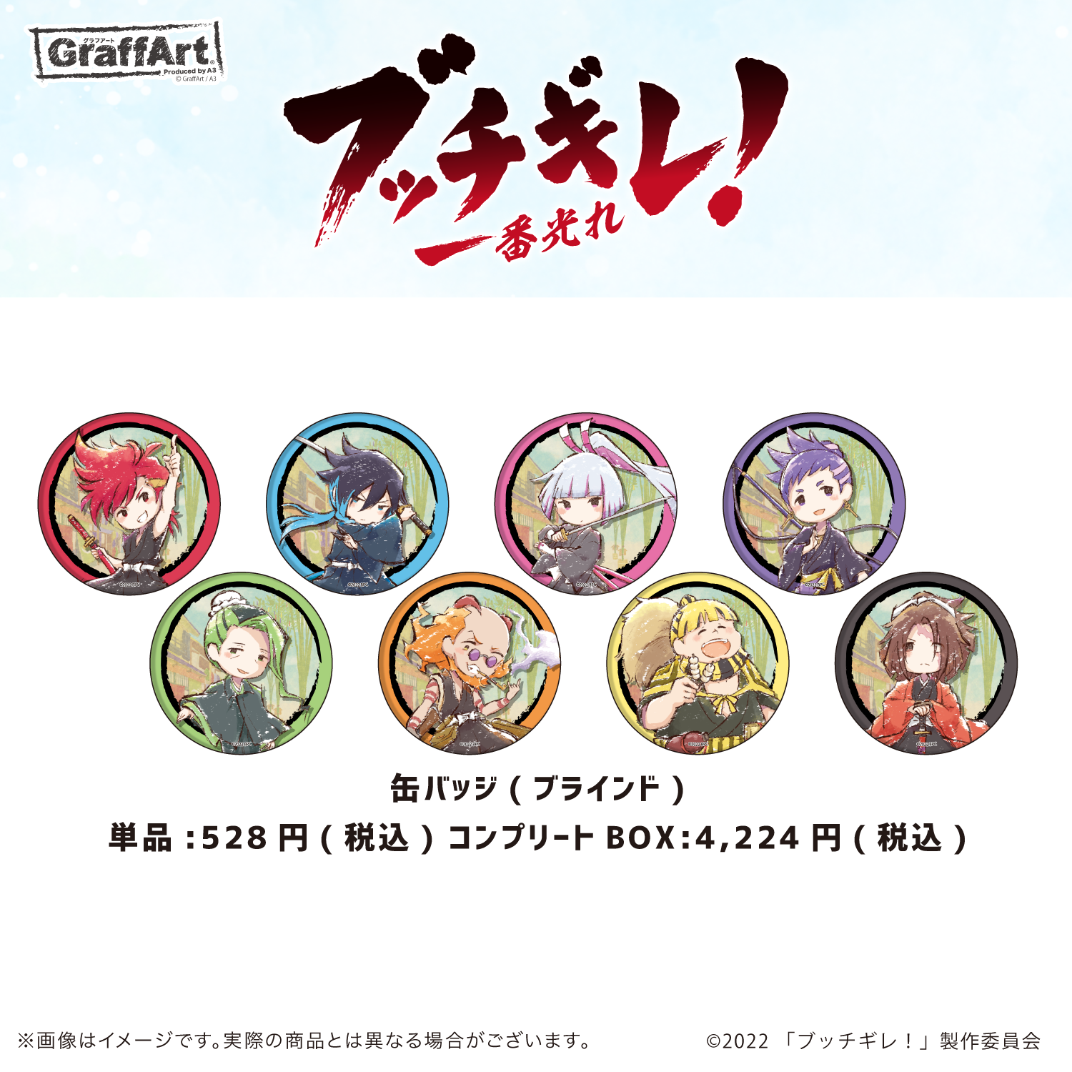 〈商品説明〉 65mmと少し大きめサイズの缶バッジです。 〈商品名〉 缶バッジ「ブッチギレ!」02/ブラインド(全8種)(グラフアート) 〈価格〉 単体 480円(税抜) BOX 3840円(税抜) 〈発売 …